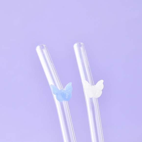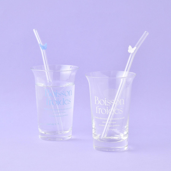 나비의 모티브가 귀엽고 빨대가 있는 유리 텀블러입니다♥
